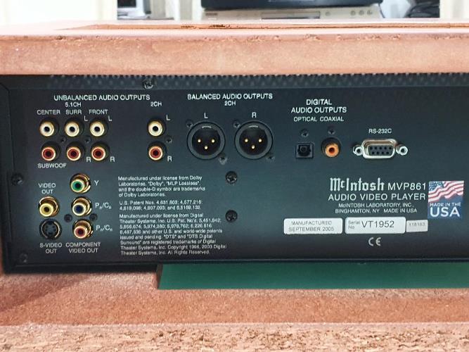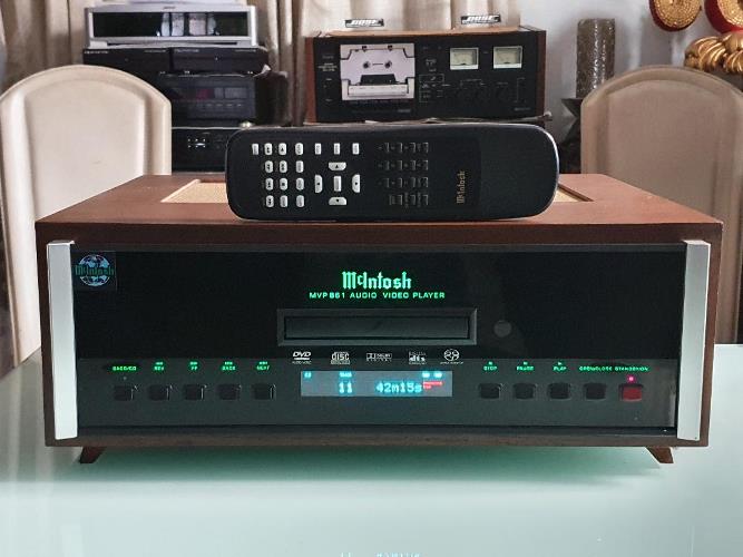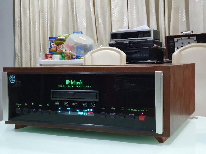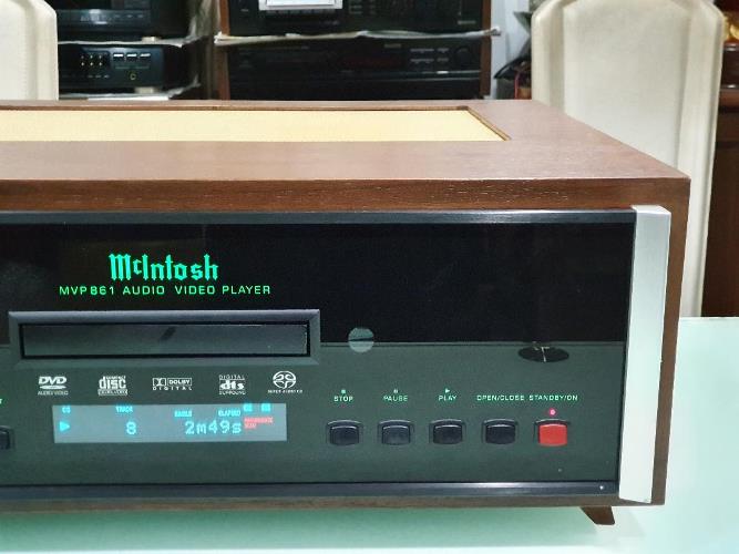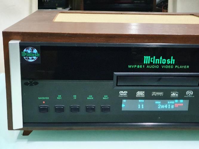 2. เข้าคู่ด้วย McINTOSH MVP-861 Universal DVD/SACD/Audiophile CD Player รุ่นใหญ่ที่มาพร้อมด้วยความสุดยอดสมบูรณ์แบบไม่ว่าจะเป็น 24 Bit/192kHz Burr Brown DACs และ 216MHz/14bit D/A Converter รวมทั้ง Farouja DCDi FLI-2301 ที่มักจะมีติดตั้งอยู่ในเครื่องเล่นระดับ Super Hi-End สามารถให้ความบันเทิงจากการชมภาพยนตร์ ด้วยการเล่น และอ่านแผ่น DVD ได้อย่างรวดเร็วทั้ง DVD-Audio, DVD-Video, Video CD, VCD, SVCD, DVD-R/RW, DVD+R/+RW, DivX และความเพลิดเพลินในการฟังเพลงจากแผ่น CD ทุกฟอร์แมททั้ง Audiophile CD, Audio CD-R, Audio CD-RW, MP3, WMA, CD-R, CD-RW รวมทั้งสุดยอดแผ่น Super Audio Compact Disc (SACD) อีกระดับคุณภาพเสียงที่เหนือกว่าแผ่น Audiophile CD ทั่วไปเป็นอย่างมาก ตัวเครื่องมีขนาดใหญ่โตมโหฬาร และหนักมาก กว้าง 48 สูง 19 ลึก 39 ซม. น้ำหนักประมาณ 20 กก.