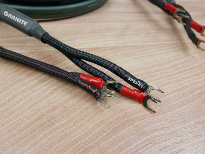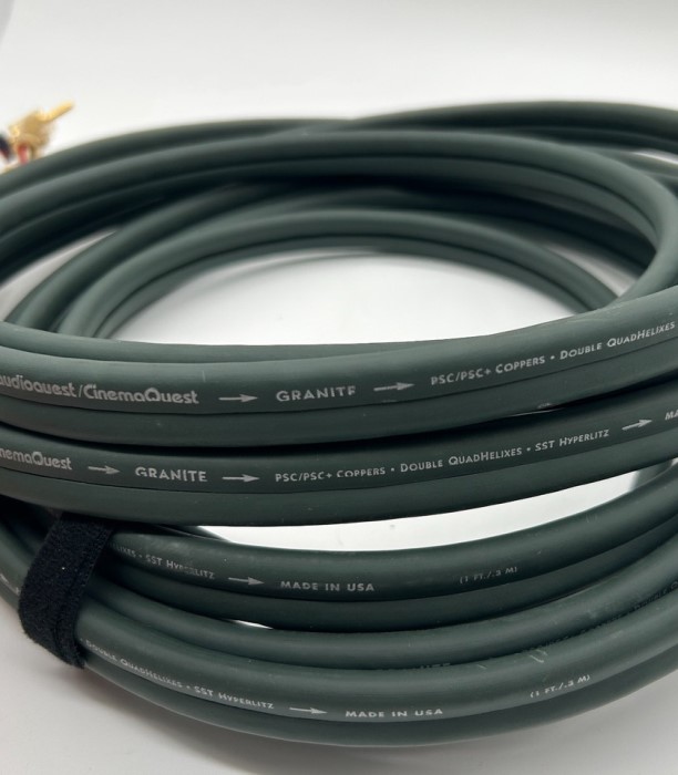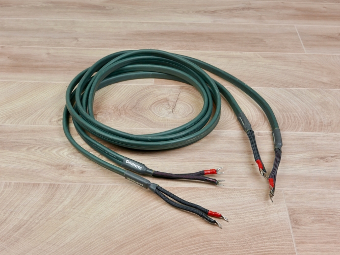 AUDIOQUEST Granite สายลำโพงรุ่นใหญ่ระดับ Hi-End แบบ "Double Quad-Helix Flat Rock" design with Long-Grain Copper (LGC) conductors, using four conductors (two 17 AWG) in a special geometry (SST) ที่มีขนาดเส้นใหญ่มากเหมือน 2 เส้นวางซ้อนกัน เรื่องคุณภาพ และมิติเสียง จึงคงไม่ต้องบรรยายถึง เพราะต้องสุดยอดไร้เทียมทานอย่างแน่นอนที่สุด ทั้งสดใส บริสุทธิ์ ชัดเจน เที่ยงตรง แม่นยำ นุ่มนวล หนักแน่น รายละเอียดเสียงสมจริงเป็นธรรมชาติ กวาดรางวัลจากสถาบันชั้นนำของโลกมาแล้วอย่างมากมาย ต้วสายสีเขียวความยาวเกือบ 6 Ft. เข้าหัวท้ายแบบ Single Wire ด้วยก้ามปู Spade รุ่นดีที่สุดของ AUDIOQUEST จากโรงงานผู้ผลิตใน USA