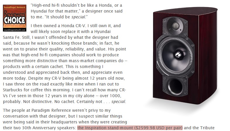 แรงบันดาลใจครบรอบ 30 ปีที่สร้างขึ้นอย่างสวยงามคือ Paradigm ลําโพงที่ดูดีที่สุดเท่าที่เคยสร้างมา และหูของฉันคือเสียงที่ดีที่สุดและความละเอียดสูงสุดของพวกเขา ... สิ่งที่สําคัญกว่าคือสิ่งนี้: ในแง่ของรูปลักษณ์ การสร้างและเสียงรวมถึงความพิเศษที่นําเสนอโดยรุ่นจํากัดและ cachet ของคุณสมบัติที่กําหนดเอง Paradigm Reference 30th Anniversary Inspiration เป็นลําโพงที่มีเอกลักษณ์และน่าสนใจอย่างมาก