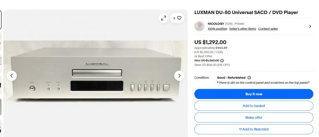 LUXMAN DU-50 MADE IN JAPAN ไฟ 220V + รีโมทคอนโทรล สภาพเดิมสวยมาก ฟังเพลงเสียงดีสุดยอดระดับ 5ดาว อ่านแผ่นปกติทุกแผ่นทั้ง MASTER / COPY / WRITE / CD /SA-CD / MP-3 ๆลๆ หัวอ่านเหมือนใหม่อ่านดี+อ่านเร็วมาก ใช้งานเหมือนใหม่ มาพร้อม XLR BALANCED OUTในตัว*ไม่มีในรุ่นเล็ก/รุ่นถูก* ออกใหม่ 4990 USD 1บ้านเรา+-160000.-* เจ้าของส่งมาฝากขายหน้าร้านถุกที่สุดเพียง 39900.-เท่านั้น
