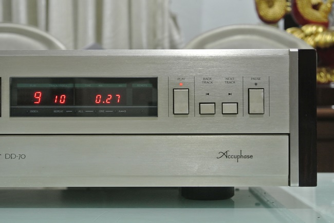 2. เข้าคู่ด้วย ACCUPHASE DP-70 เครื่องเล่น Audiophile CD Player ระดับ Hi-End คุณภาพดีที่สุดในโลก ผลงานชิ้น Masterpiece ที่มีความสุดสวย แสนคลาสสิคในระดับ State of The Art ด้วยตัวเครื่องสีทองแชมเปญหรูหรามากคุณค่า เข้าด้านข้างตัวเครื่องด้วยไม้ธรรมชาติเคลือบเงาสี Oil Walnut ภายในตัวเครื่องมาพร้อมด้วยความสุดยอดสมบูรณ์แบบไม่ว่าจะเป็น 24 Bit/192kHz Burr Brown DACs และ 216MHz/12bit D/A Converter รวมทั้งชิพ ICL8010ACPD ทั้งหมด 10 ตัวเป็นภาคขยาย ที่มักจะมีติดตั้งอยู่ในเครื่องเล่นระดับ Hi-End สามารถให้ความเพลิดเพลินในการฟังเพลงจากแผ่น CD ทุกฟอร์แมททั้ง Audiophile CD, Audio CD-R, Audio CD-RW, CD-R, CD-RW ได้อย่างรวดเร็ว แม่นยำ ถาดใส่แผ่น CD ที่ขนาดใหญ่มาก แต่กลับเลื่อนเข้า-ออกด้วยความนุ่มนวล ไร้เสียงรบกวนใด ๆ ตัวเครื่องด้านล่างมีปุ่มเลื่อนให้ Lock ถาดใส่แผ่น ช่วยป้องกันไม่ให้เกิดความเสียหายระหว่างยกเคลื่อนย้ายได้ ตัวเครื่องมีขนาดใหญ่โต และหนักมากพอ ๆ หรืออาจจะมากกว่า Power Amplifier บางยี่ห้อเลยทีเดียว กว้าง 48 สูง 14 ลึก 38 ซม. น้ำหนักประมาณ 21 กก.